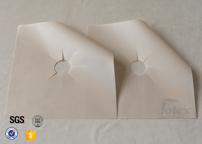 The basic fiberglass fabric is capable of withstanding heat below 550℃. And the PTFE coating can be used from -70℃ to 260℃. Standard thickness of beige gas range protectors is 0.11mm. Size is 27x27cm(10.6X10.6") with a 4cm diameter hole.